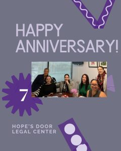Hope’s Door Legal Center celebrates 7 years of service! In the Hope’s Door Legal Center, we provide trauma-informed, high-quality legal services to help survivors to escape their abuser, establish their rights, and take back control of their lives. The mission of the Legal Center is to empower victims of domestic violence through greater access to legal protections and remedies critical to their survival and safety.